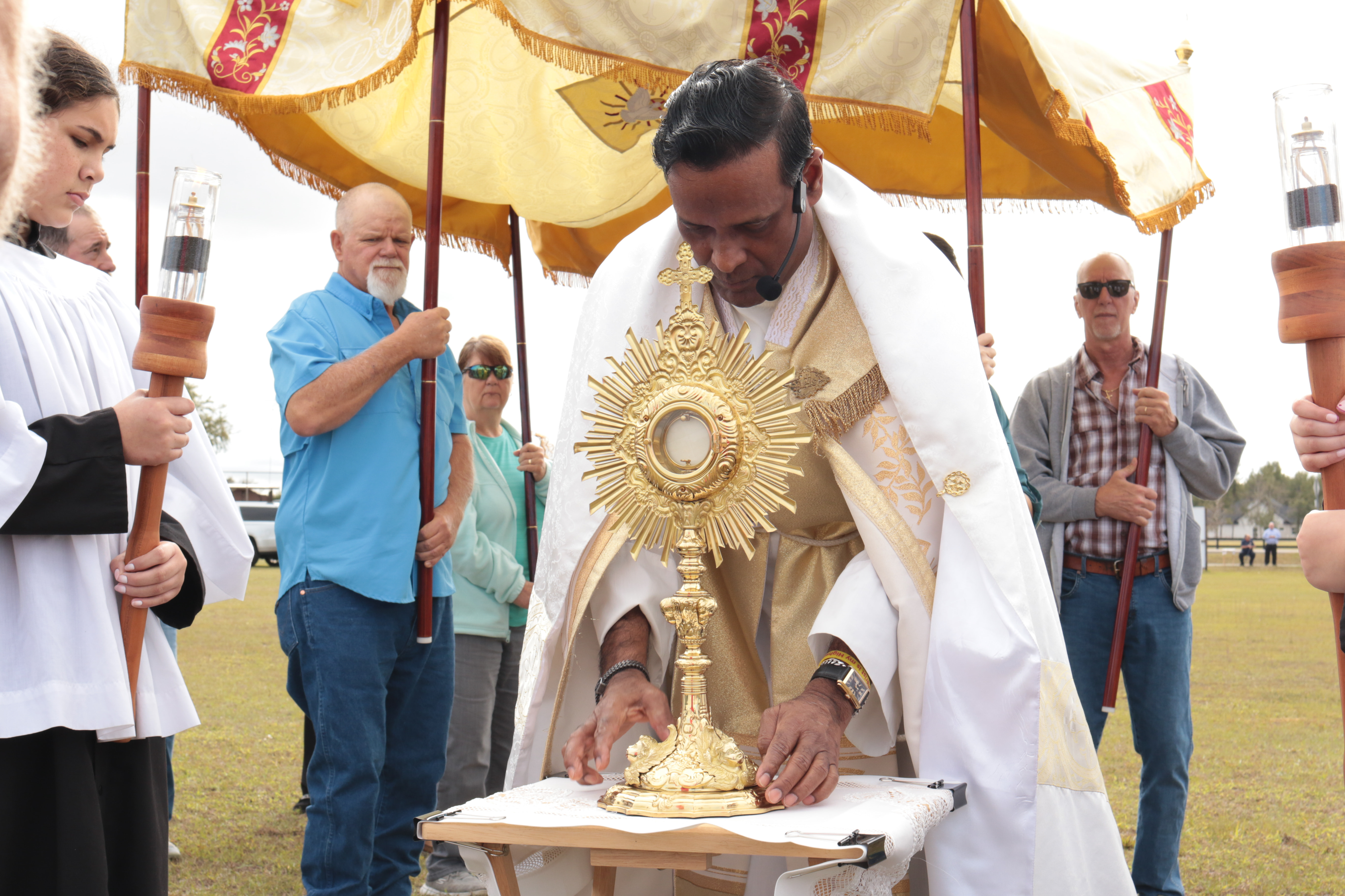 At each stop, Fr. Romaine imparted blessings for the parish, the local community, the Diocese of Saint Petersburg, the state, and the world. The procession was led by a group of altar servers and individuals carrying an image of Divine Mercy. Members of the local Knights of Columbus council stood in reverent guard at each station, awaiting the arrival of the Eucharistic Lord, before joining the procession at the conclusion of each blessing.