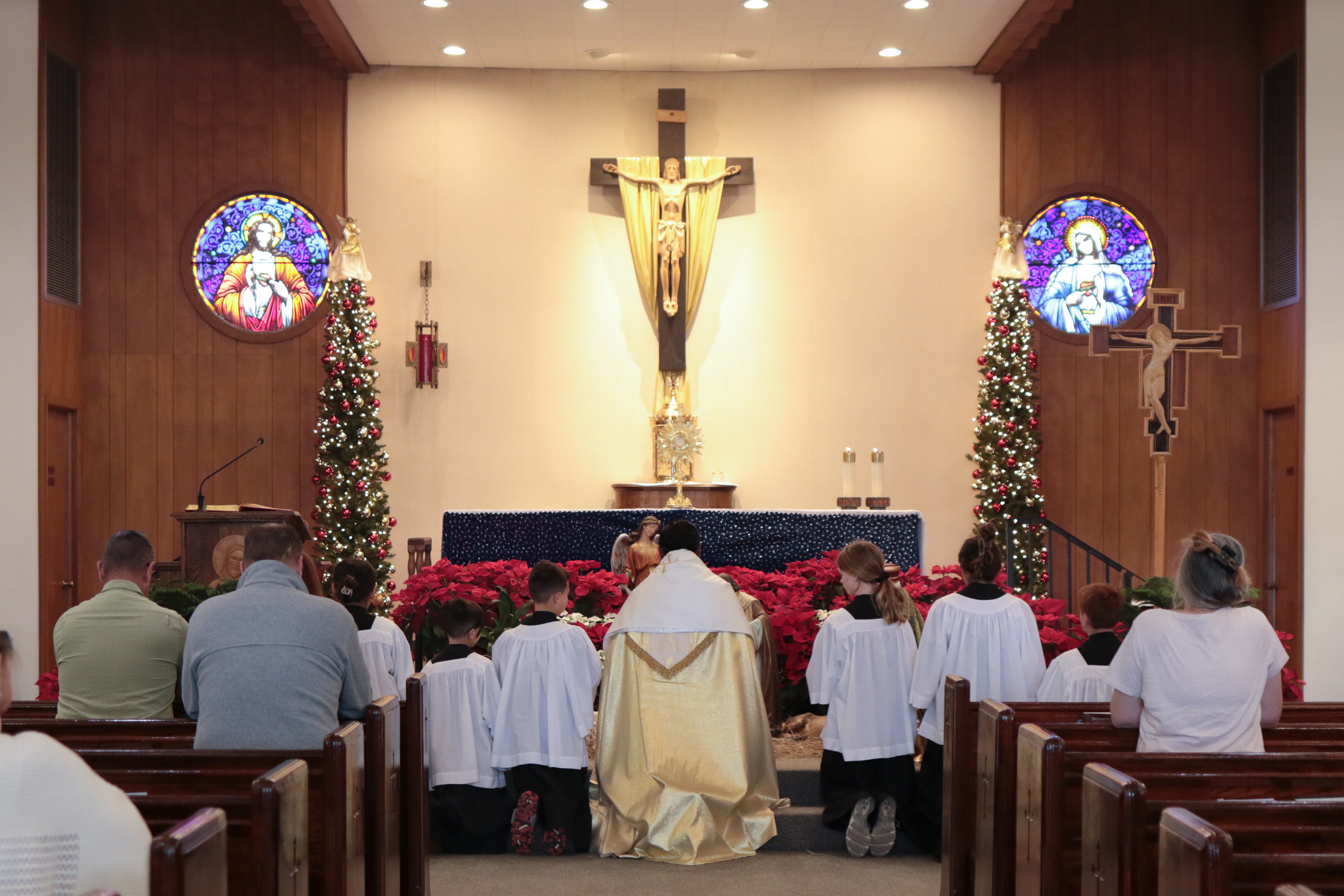 At the conclusion of Mass, the Blessed Sacrament was placed in the monstrance while parishioners prayed and sang. The congregation then followed Pastor Robert G. Romaine, who carried the monstrance with our Lord around the parish circle. Along the route, the procession passed Christmas “card” decorations erected by parish groups and families, pausing at four designated stations along the procession route.