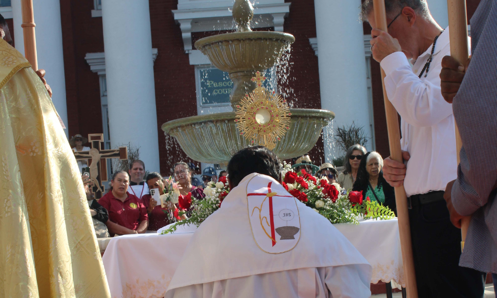 Along the way, key sites, such as Catholic Charities in Dade City, were blessed. At the final stop, the Dade City Courthouse, the community knelt together for a moment of adoration and blessing. Joy and love were evident on the faces of those present, filling the celebration with a profound sense of peace and hope. The day reminded all of Christ’s Kingship—not only over the world but also within their hearts and community. The procession became more than a public display of faith; it was a shared spiritual experience that inspired and strengthened everyone who participated.