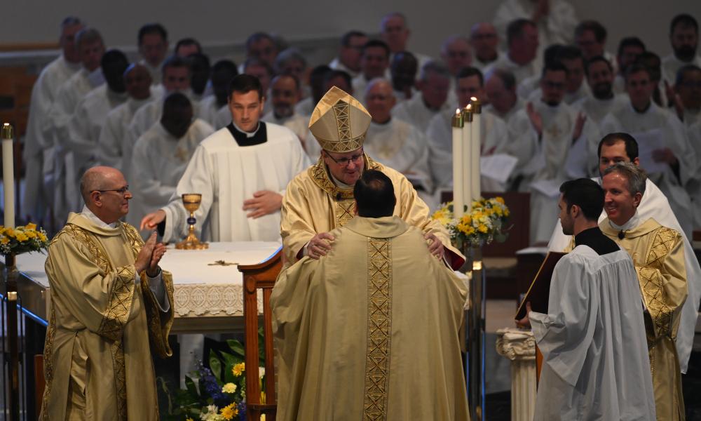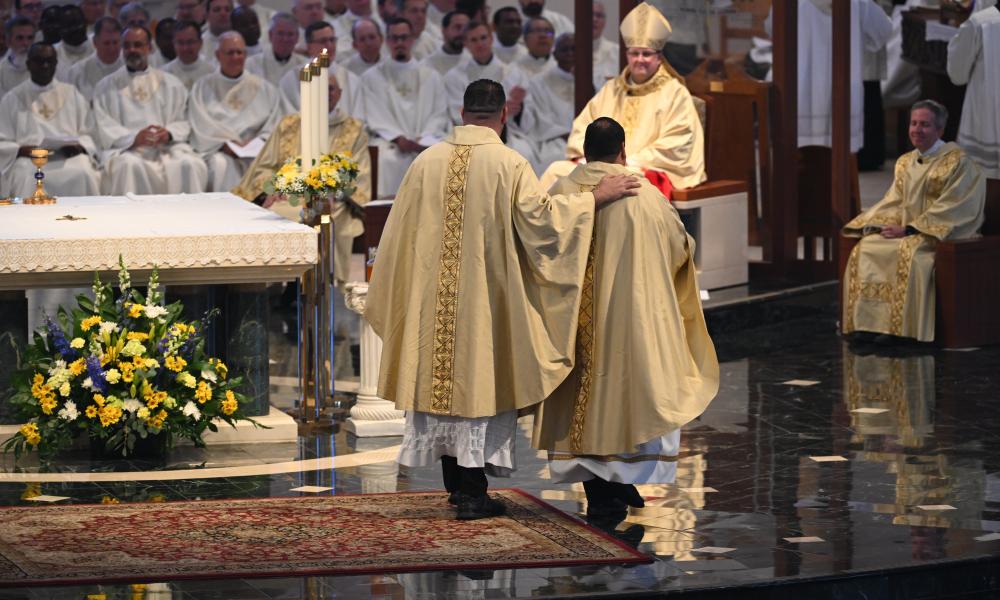 3. After all the priests had offered Father Christian the Sign of Peace, Father Chuck Dornquast, diocesan Director of Vocations, walked him back behind the altar to take his place among all the priests of the Diocese, in an area of the sanctuary called the presbytery. Father Christian sat next to Monsignor John Cippel, a mentor and friend, who had once served at the St. Vincent de Paul Regional Seminary as professor and spiritual director. The priests started this applause and the congregation followed.