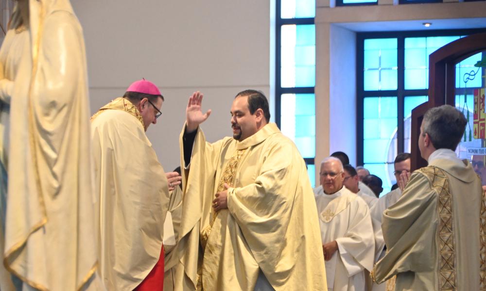 May 22, 2023 | The priesthood ordination of Father Christian Galvan on May 20, 2023, was a solemn liturgy by all accounts. Two of the most notable examples were when Bishop Gregory Parkes placed his hands over Father Christian and called upon the Holy Spirit to mark his soul with the sacred priesthood, and when Father Christian laid on the floor in front of the altar, face down, in an act of pure humility, while the faithful prayed for the Lord's assistance and for the intercession of all holy men and women of heaven.