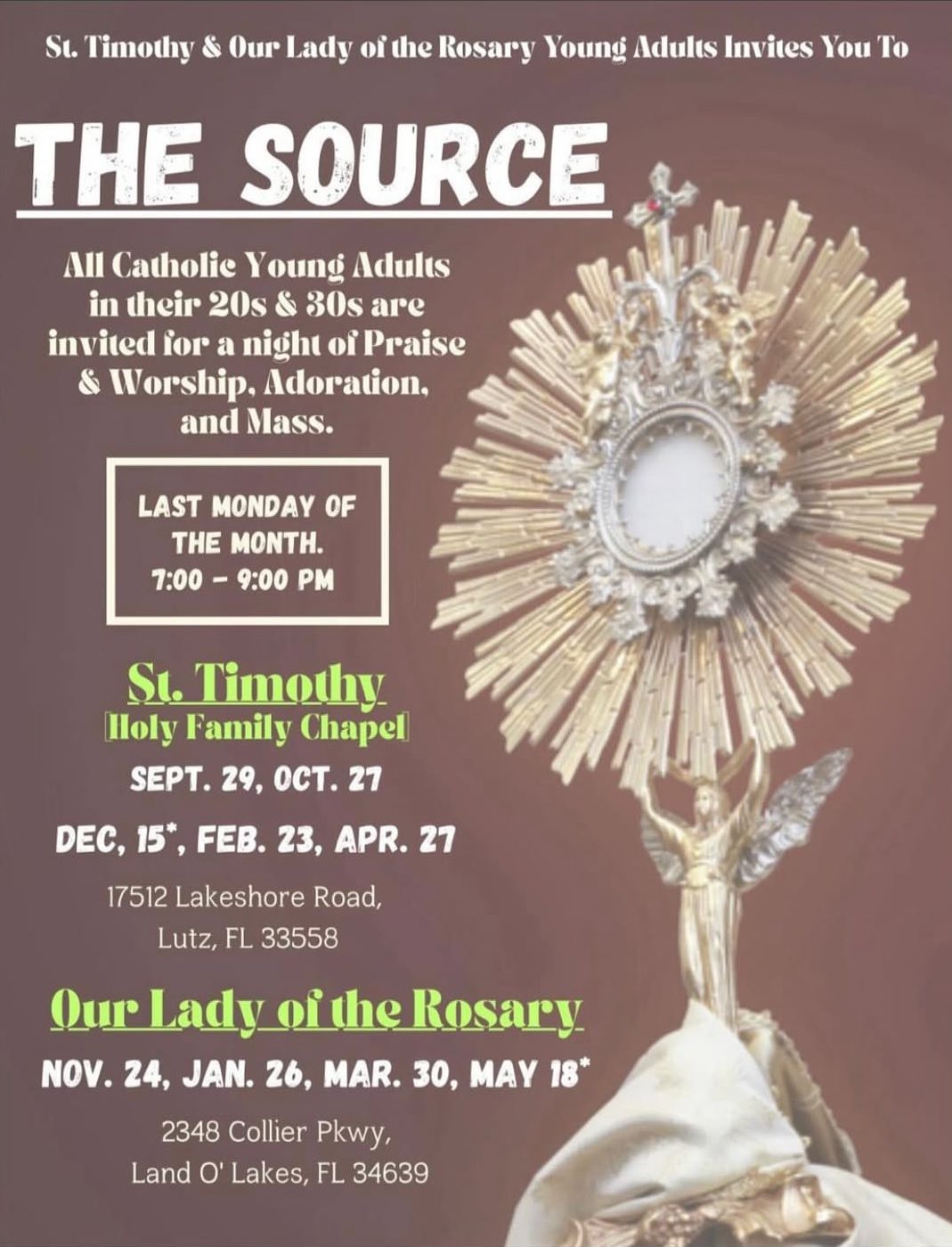 The Source takes place the last Monday of every month (adjusted for holidays), alternating between St. Timothy Catholic Church (17512 Lakeshore Rd., Lutz) and Our Lady of the Rosary Catholic Church (2348 Collier Pkwy., Land O’ Lakes). Adoration and confession begin at 7 p.m., followed by Mass at 8 p.m.